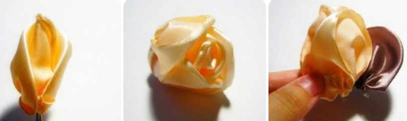 - Выполнив несколько оборотов, сделанный таким образом бутон, необходимо прошить для закрепления. Нужно зафиксировать каждый оборот ленты. Когда изделие достигнет нужного размера, пинцет необходимо удалить.
