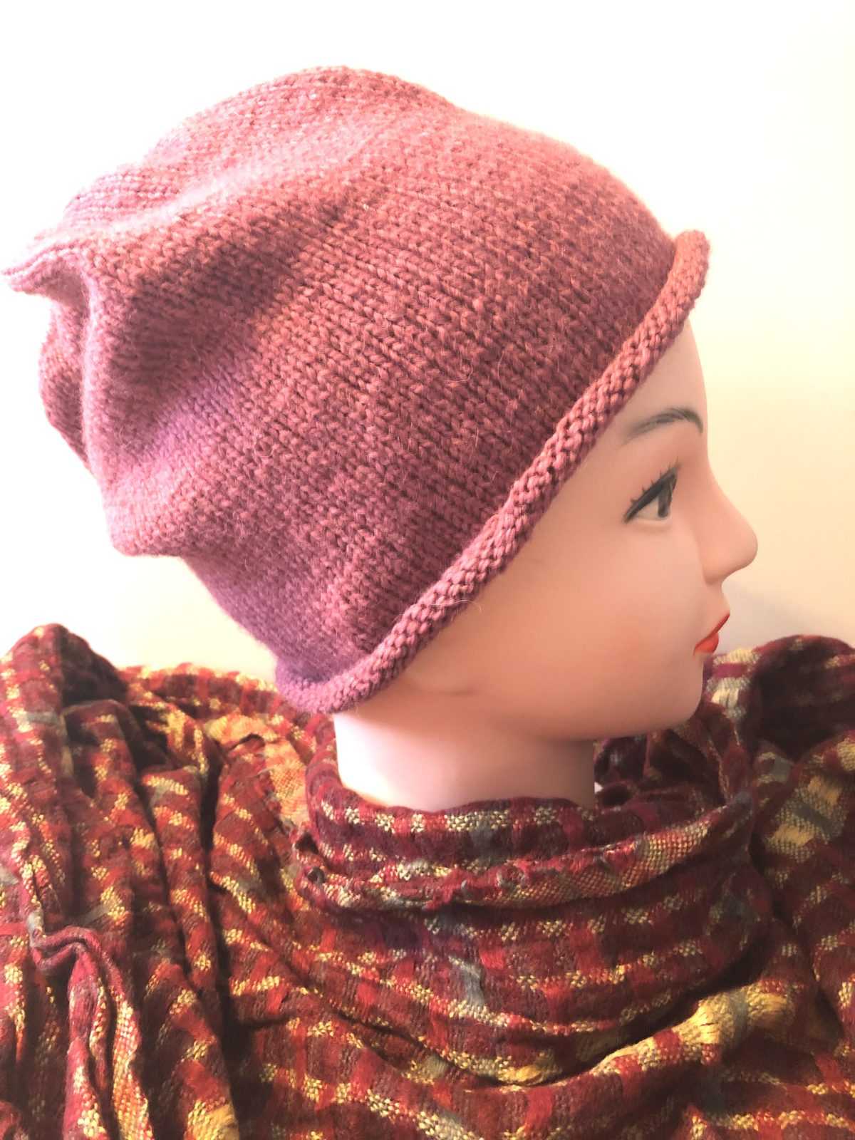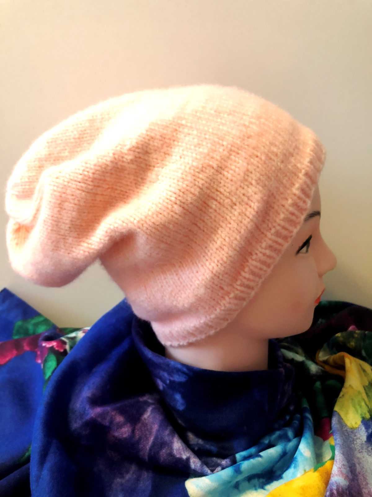 Современная молодежная модель бини выглядит более свободной. Она похожа на колпак с последовательным сужением, макушка которого не переходит в угол, а остается довольно широкой. Техникой вязания шапка похожа на предыдущую модель, однако вяжется она без укороченных рядов.