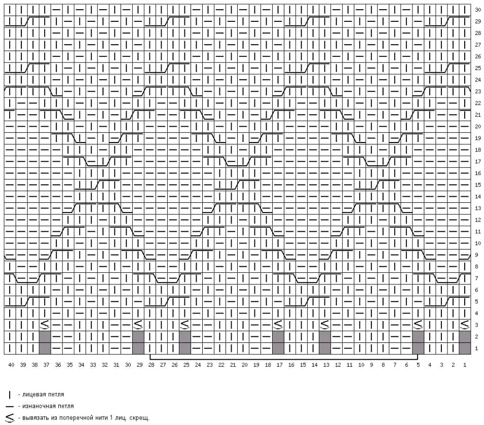 Перекрещивание (ПКР) вправо 2 лиц/2 лиц: 2 пет. снять на вспомогательную спицу и оставить за работой, вязать 2 лиц, затем 2 лиц. со вспомогательной спицы. Перекрещ. (ПКР) влево 2 лиц/2 лиц: 2 пет. снять на вспомогат. спицу и оставить перед работой, вязать 2 лиц, затем 2 лиц. со вспомогательной спицы. Перекрещ. (ПКР) вправо 2 лиц/2 изн: 2 лиц. снять на вспомогательную спицу и оставить за работой, 2 изн., затем 2 лиц. со вспомогат. спицы. Перекрещ. (ПКР) влево 2 изн/2 лиц: 2 пет. снять на вспомогат. спицу и оставить перед работой, 2 лиц., затем 2 изн. со вспомогат. спицы.