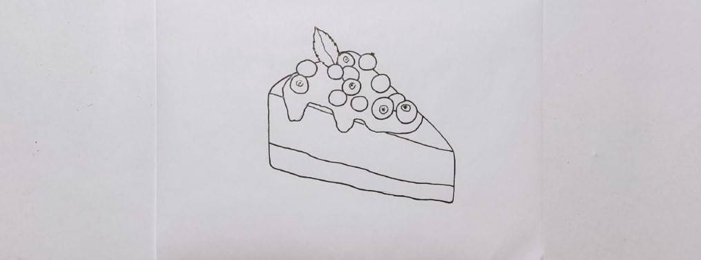 Далее сверху прорисовываем небольшой кривой линией крем для пирога. А также рисуем небольшие кружочки на верхней части пирога, которые будут в дальнейшем ягодами. Кружки рисуем разного размера и можно группировать по два-три вместе, а в некоторых местах по одному кружочку. В конце рисуем небольшой листик в дальней части пирога.