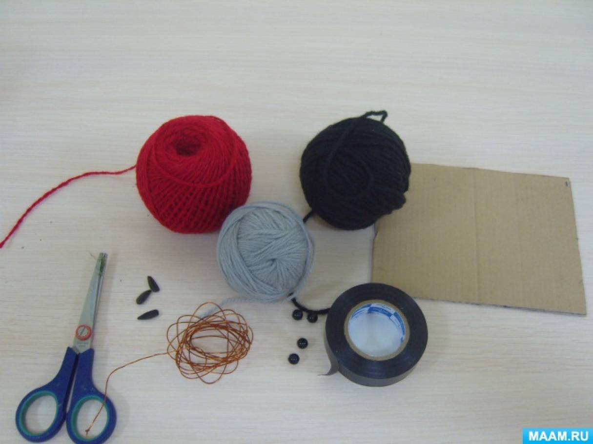 — нитки чёрного, красного и серого цвета (желательно одной толщины); — проволока; -две бусинки для глаз, -семечка для клюва; -немного чёрной изоленты для обмотки проволоки, -ножницы, -клей, — картонка 9 х12