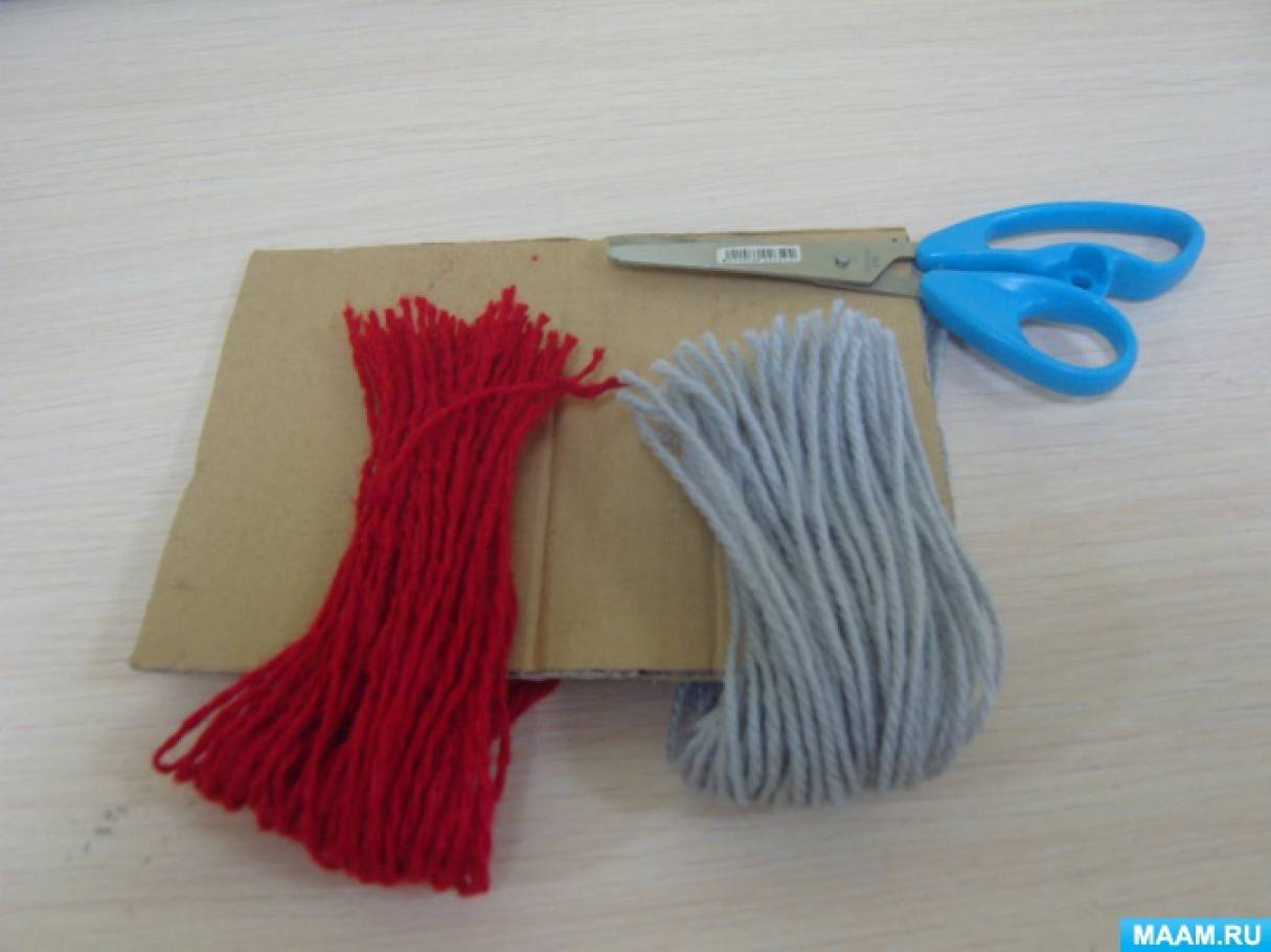Наматываем красные и серые нитки на короткую сторону шаблона и разрезаем с одной стороны.