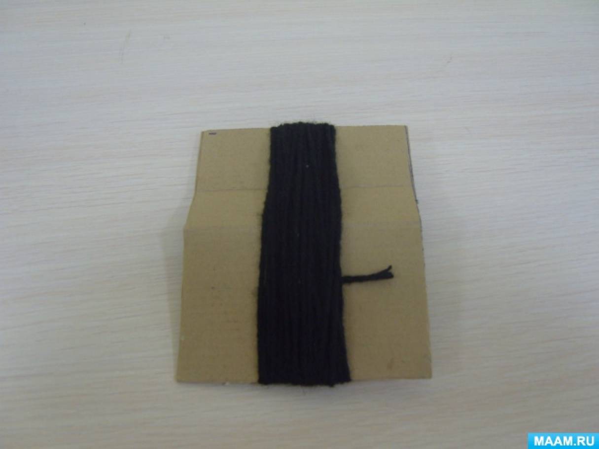 Начинаем мастерить: берём наш картонный шаблон и наматываем чёрные нитки на длинную сторону, примерно 30 оборотов для спинки снегиря.