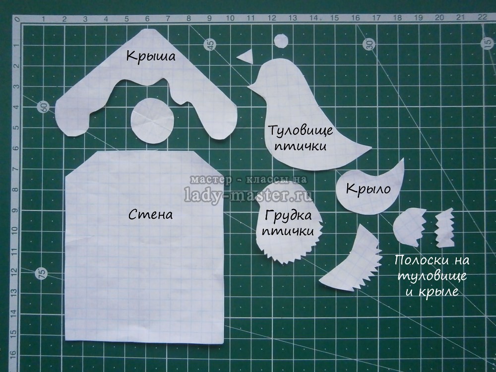 1. Выкройка этой елочной игрушки состоит из более крупных деталей и совсем мелких деталек. Нам нужно вырезать из бумаги стену птичьего домика, крышу, круглое окошко, туловище птички, грудку птички, крыло, полоски для туловища и крыла, маленький глазик и клювик.