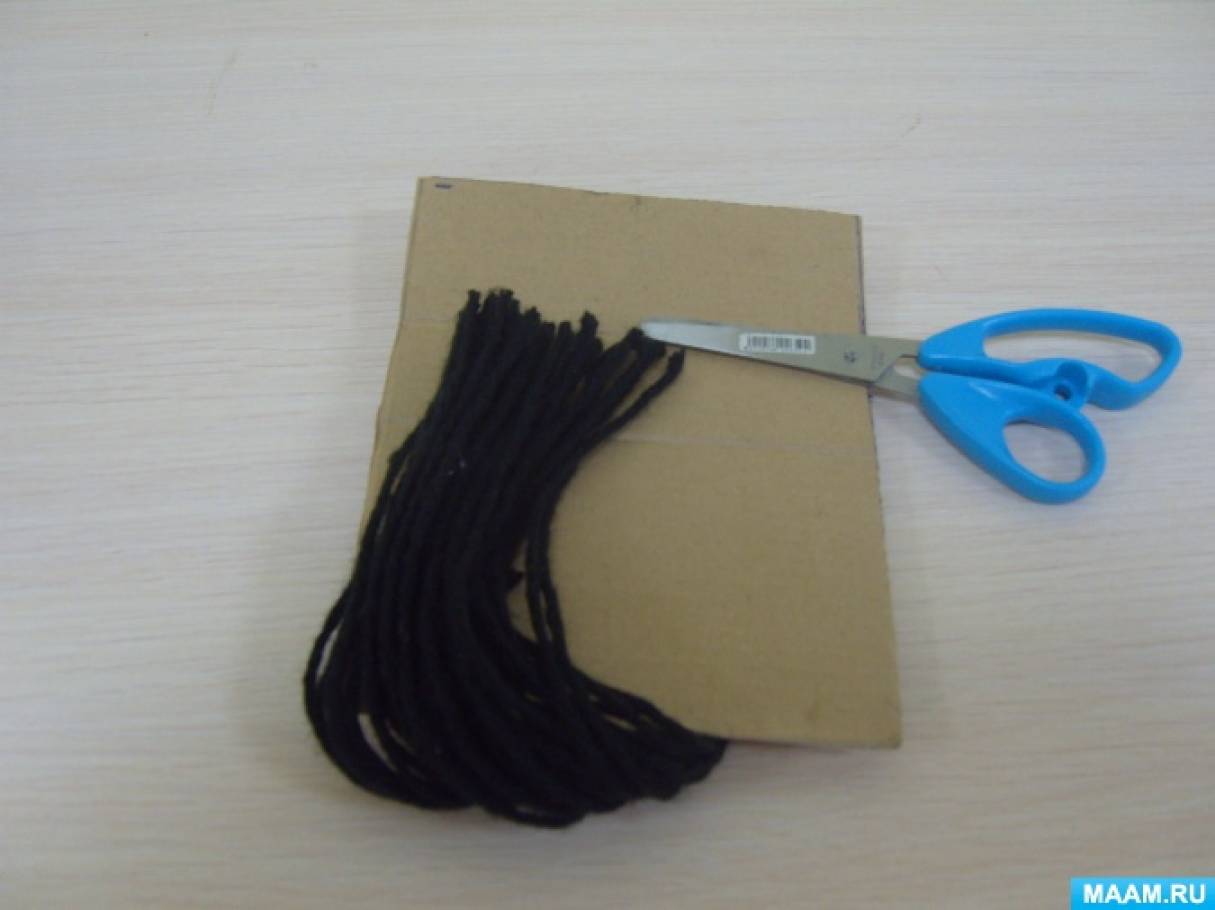 - Аккуратно вставив ножницы между картонками, разрезаем пряжу. Вставляем посередине нитку и перевязываем. Непрокрашенную деталь снимаем и расправляем обрезанные концы.