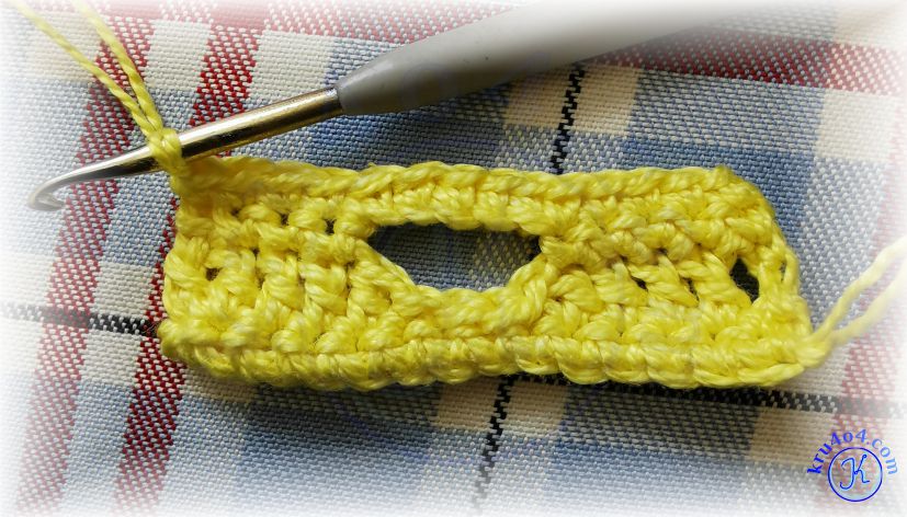 Продолжить вязание столбиков как описано выше до конца петель цепочки. Для выполнения следующего ряда — повернуть работу, сделать три воздушные петли для подъема.