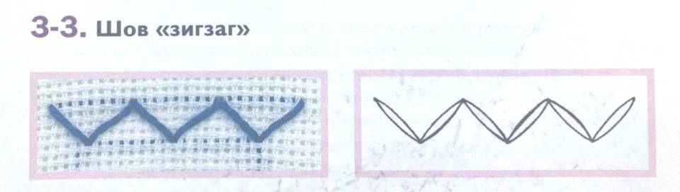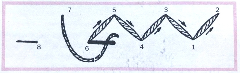 Шов «зигзаг» (3-3) выполняется справа налево. Нить закрепляется в точке 1 на нижней линии шва. Затем делаемся диагональный стежок (1-2) вверх и вправо. Игла вкалывается в точку 2, расположенную на верхней линии, уходит на изнанку, где делает горизонтальный стежок (2-3) влево. Расстояние между точками 2 и З равно двум горизонтальным отрезкам между точками 1 и 2. В точке З игла выходит на лицо. Далее выполняется второй диагональный стежок (3-1) вниз и вправо. Игла вкалывается в точку 1, уходит на изнанку, где делает горизонтальный стежок (1-4) влево. В точке 4 игла выходит на лицо. Затем выполняется третий диагональный стежок (4-3) вверх и вправо. Далее от точки З шов выполняется так же, как от точки 2. Расстояния между точками 2 и 3, 1 и 4,3 и 5, 4 и 6, 5 и 7, 6 и 8 и т.д. равны между собой.