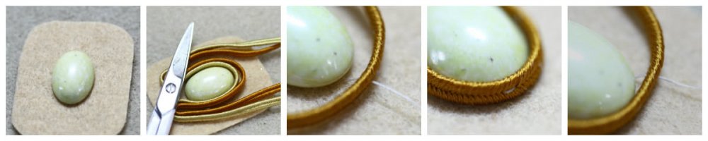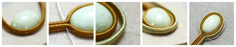 - Плотным шнуром по краю огибается кабошон. Он аккуратно пришивается за край.