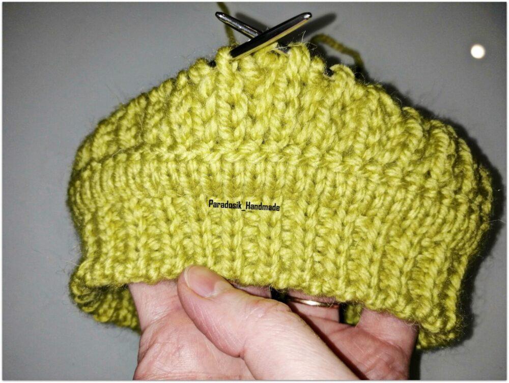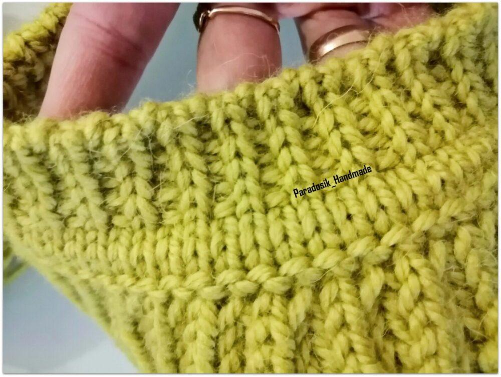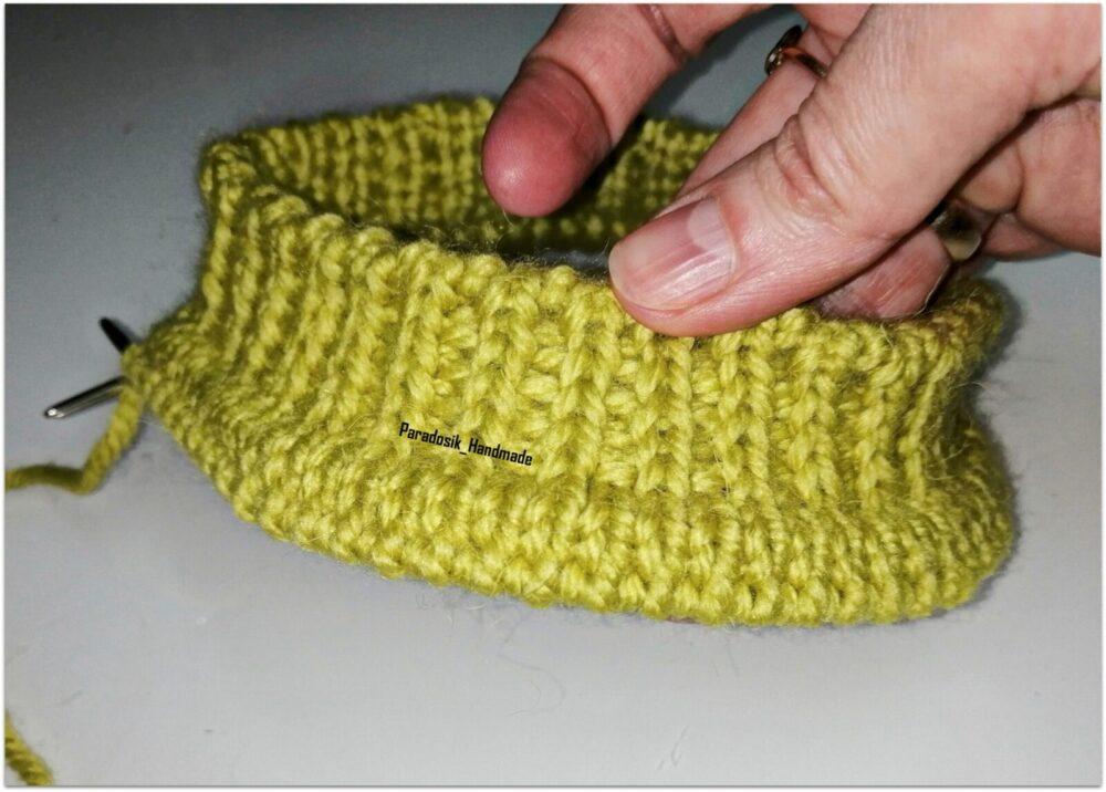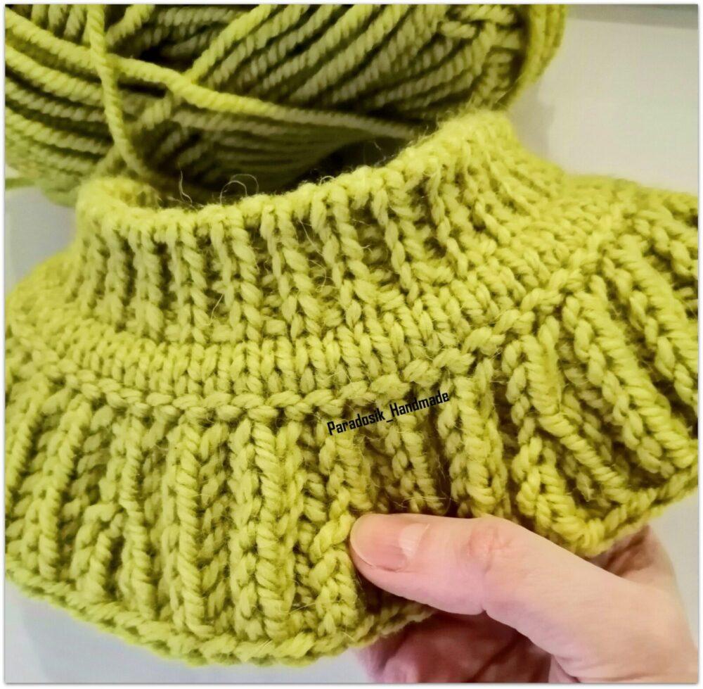 При вязании снизу всё то же самое, только меняется очередность: сначала провязываете один изнаночный ряд, затем начинаете прибавление петель для полой резинки, в конце делаете убавление — 2 вместе лицевыми или 2 вместе изнаночными (смотря какой узор будет дальше) и затем любая резинка ворота или даже просто платочка (тоже красиво будет).