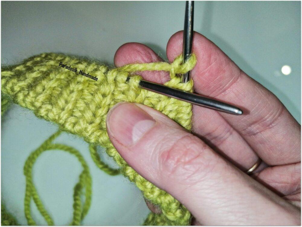 - Вставьте крючочек в первый проем между петельками.