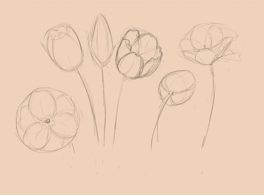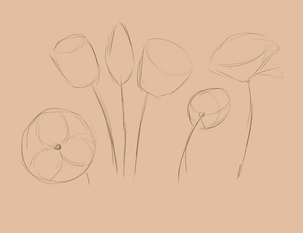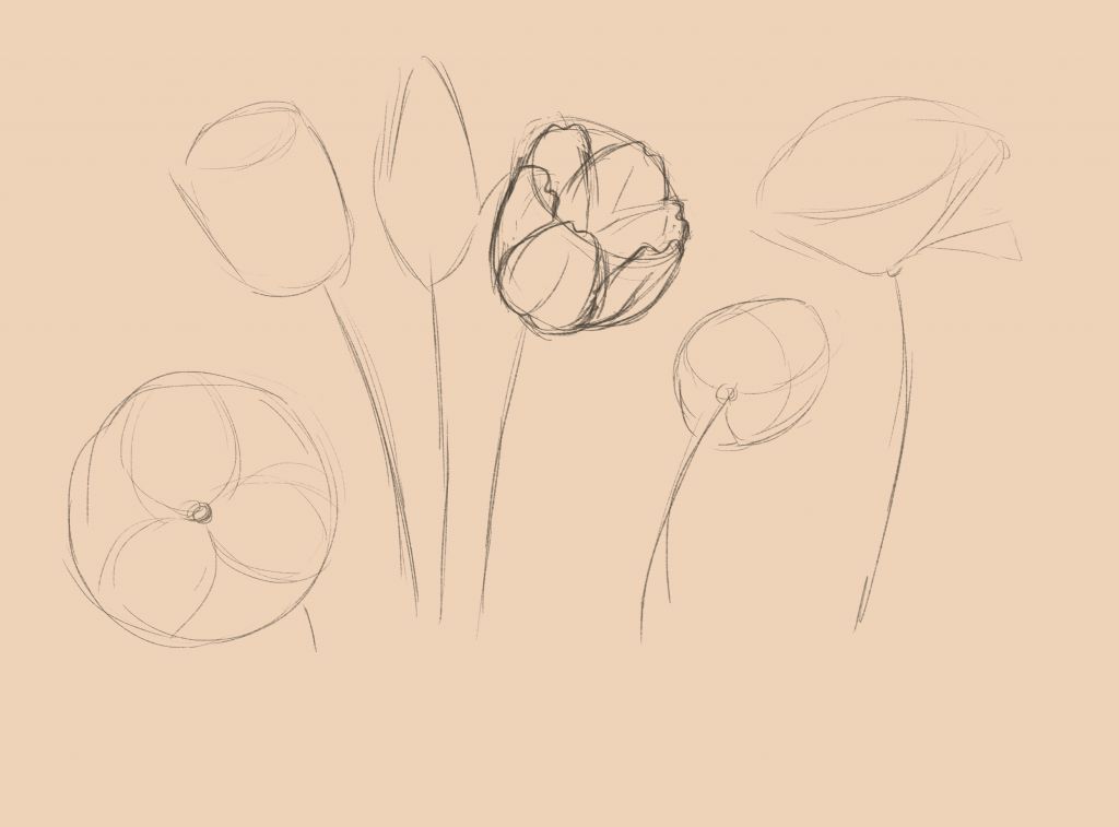 Наша задача понять, как нарисовать тюльпан с разных ракурсов и на разных стадиях цветения.