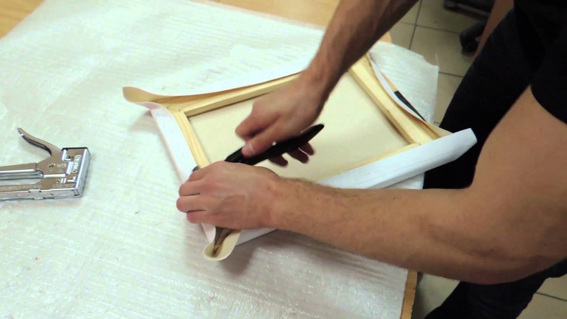 Первыми крепятся уголки. Проверяем, находится ли работа точно по центру и достаточно ли туго она натянута. Затем приступаем к креплению боковых сторон. После того, как ткань надежно закреплена, рамка собирается – на нее кладется стекло, а сама конструкция укрепляется с помощью металлических зажимов.
