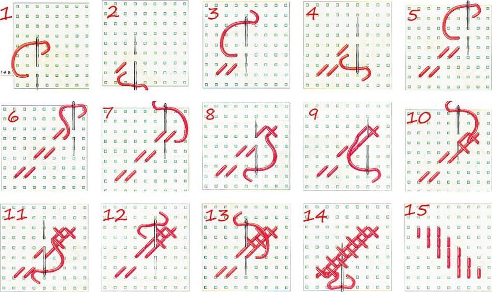 - второй стежок захватывает следующую пару диагональных углов, возвращая иголку на сторону начала работы.