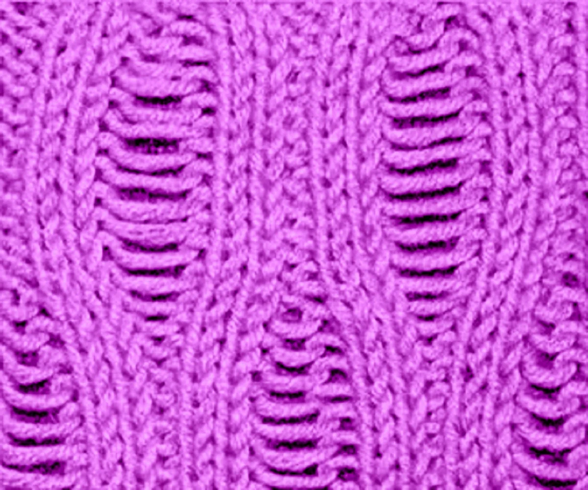 Рельефный вариант этого узора выполняется двумя способами. Первый вяжется из 4 рядов, как и классический, его раппорт состоит из 17 петель.