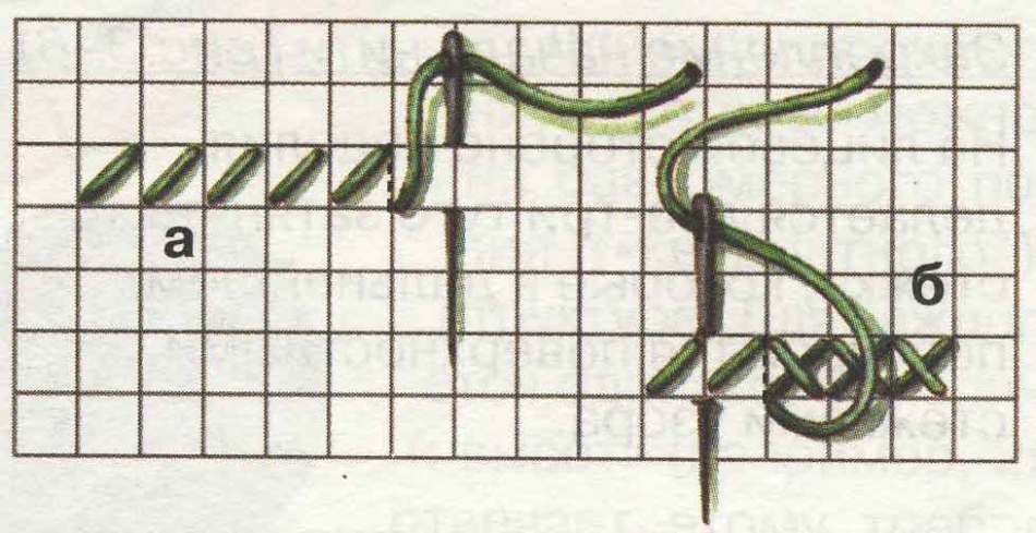 Сперва закрепляют прочно нить, затем вводят игу с изнанки в нижнюю левую дырочку клеточки и накладывают стежок, вставляя иглу в верхнюю правую дырочку. Стежок ложиться по диагонали. Далее следует, так называемый, «зеркальный» стежок, который повторяется с противоположным направлением: из правого уголка в левый.