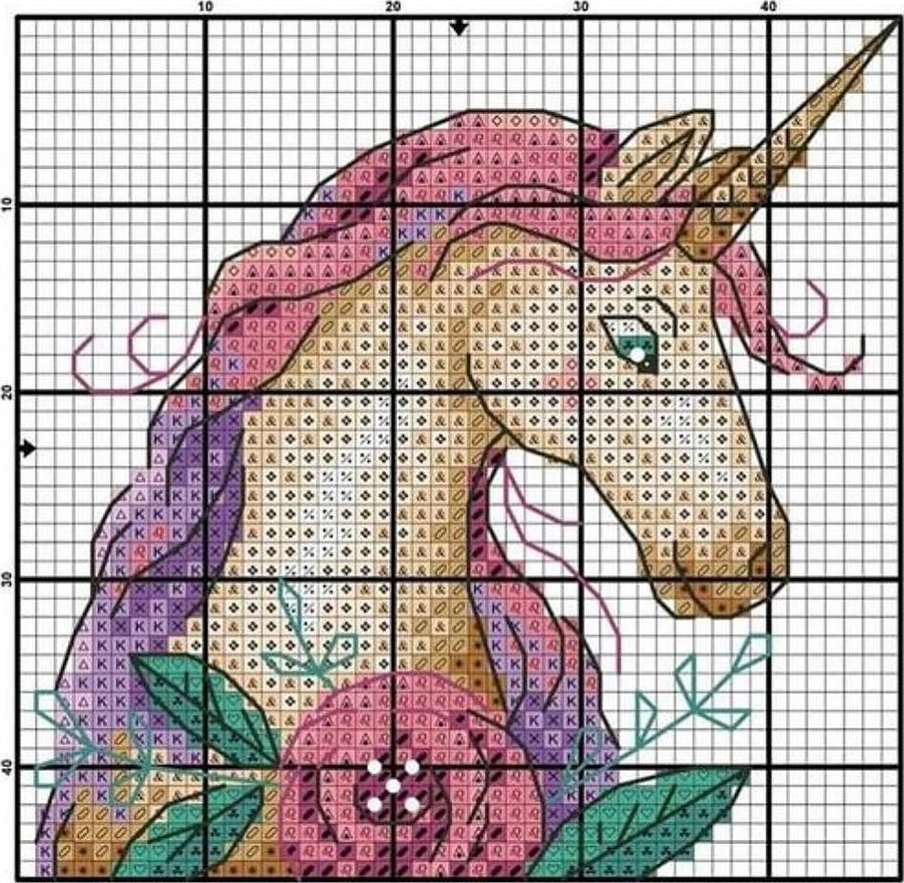 Существует поверье, если вышить единорога своими руками, то незамужняя девушка выйдет за муж, а у семейной пары родиться долгожданный младенец. Поэтому такие схемы могут стать дополнительным стимулом к тому, чтобы вышить это мифическое животное. Предлагаем вам рассмотреть простой вариант схемы, но уже с использованием нескольких оттенков нитей. Картинка довольно-таки маленькая, поэтому для вышивки возьмите отрезок канвы 9 на 9 см. Также понадобятся нитки серого, черного, фиолетового и розового цвета. Гриву и хвост животного можно оформить мулине с блестящими вкраплениями. Таким образом вышивка получится более заметной и яркой.