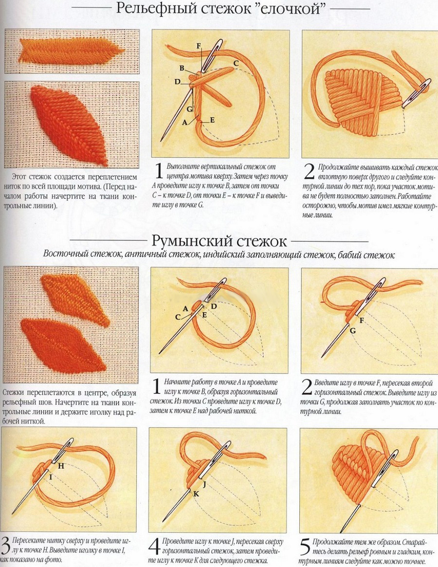 Очень красив рельефный шов «ёлочкой», в нём накладываются друг на друга диагональные скрещивающиеся стежки. Центр листа вышейте румынским стежком.