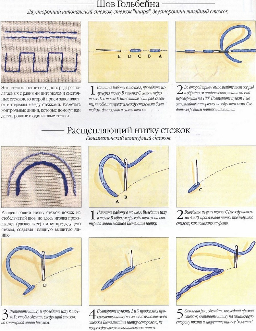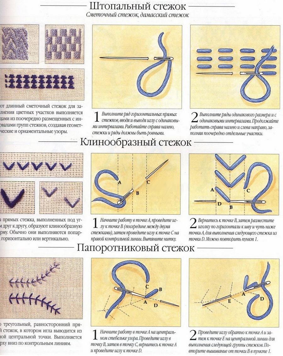 Прямой стежок можно выполнить под любым углом. Открытыми стежками «ёлочкой» вышивают листики, папоротниковым стежком выполняют хрупкие длинные стебли, стебельчатым швом вы создадите ровную безупречную линию. Расщепляющий стежок нужен для контурных линий.