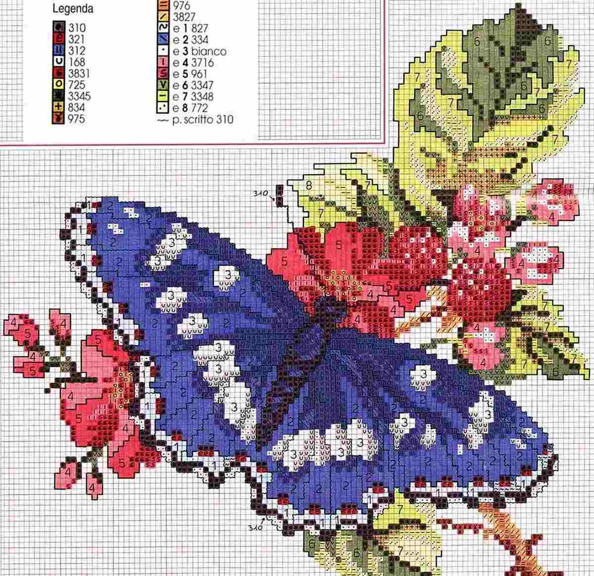 При выборе определенной схемы нужно иметь в виду, что вышивка бабочки может быть выполнена не только крестиком, но и полукрестом, бэкститчем и французскими узелками.