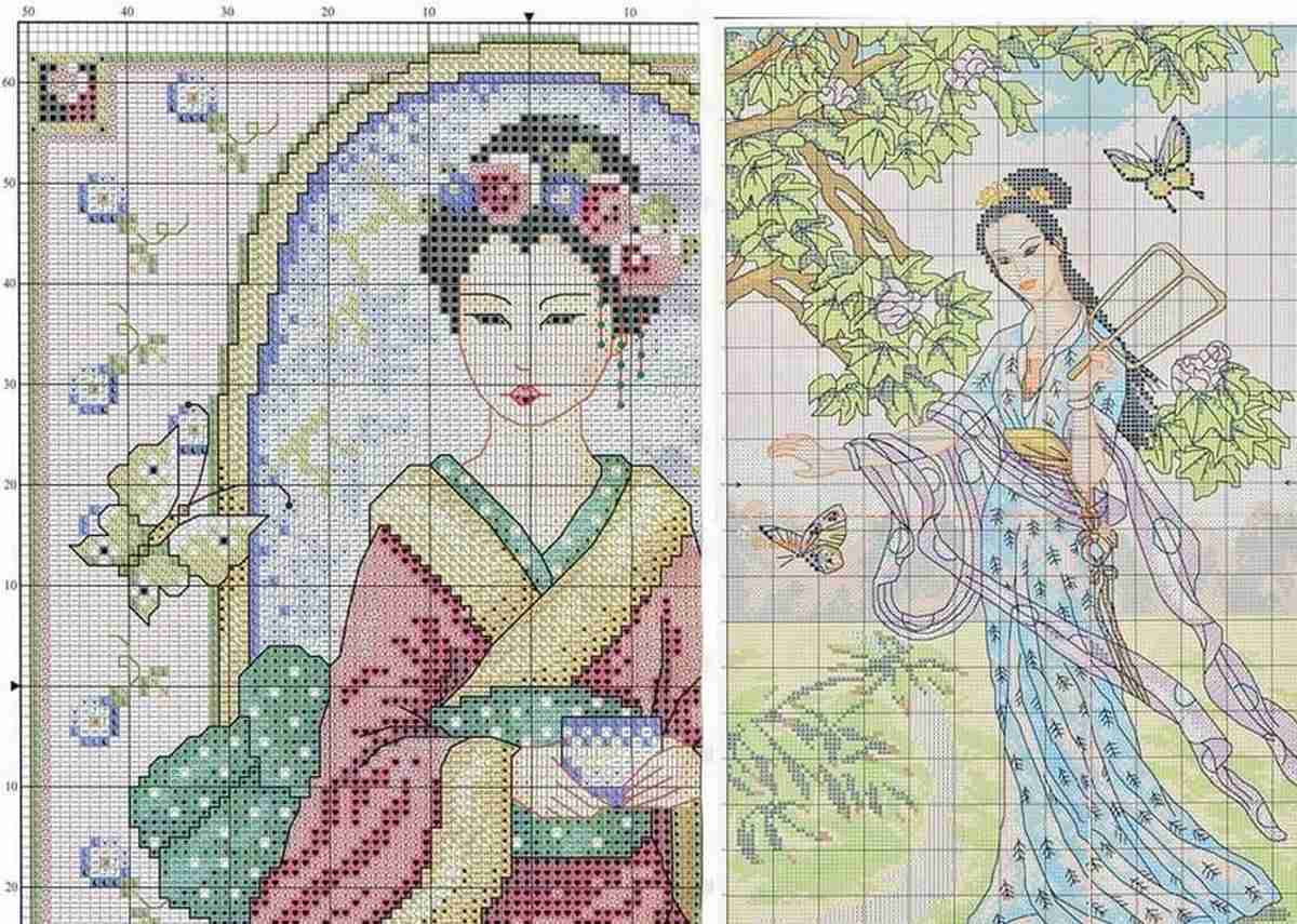В основном рукодельницы выбирают схемы, которые отображают их настроение, а также душевное состояние в данный момент. Если это романтическое настроение, тогда следующая схема вам понравится больше всего. На ней показана утонченная девушка восточной внешности с веером в руке, а вокруг нее порхают эти прекрасные создания с большими крыльями. Такое панно может стать эксклюзивным презентом для близких и родных на любое торжество. Такой рисунок можно вышить даже на предметах повседневного пользования. Это может быть чехол для очков или другая любая вещь.