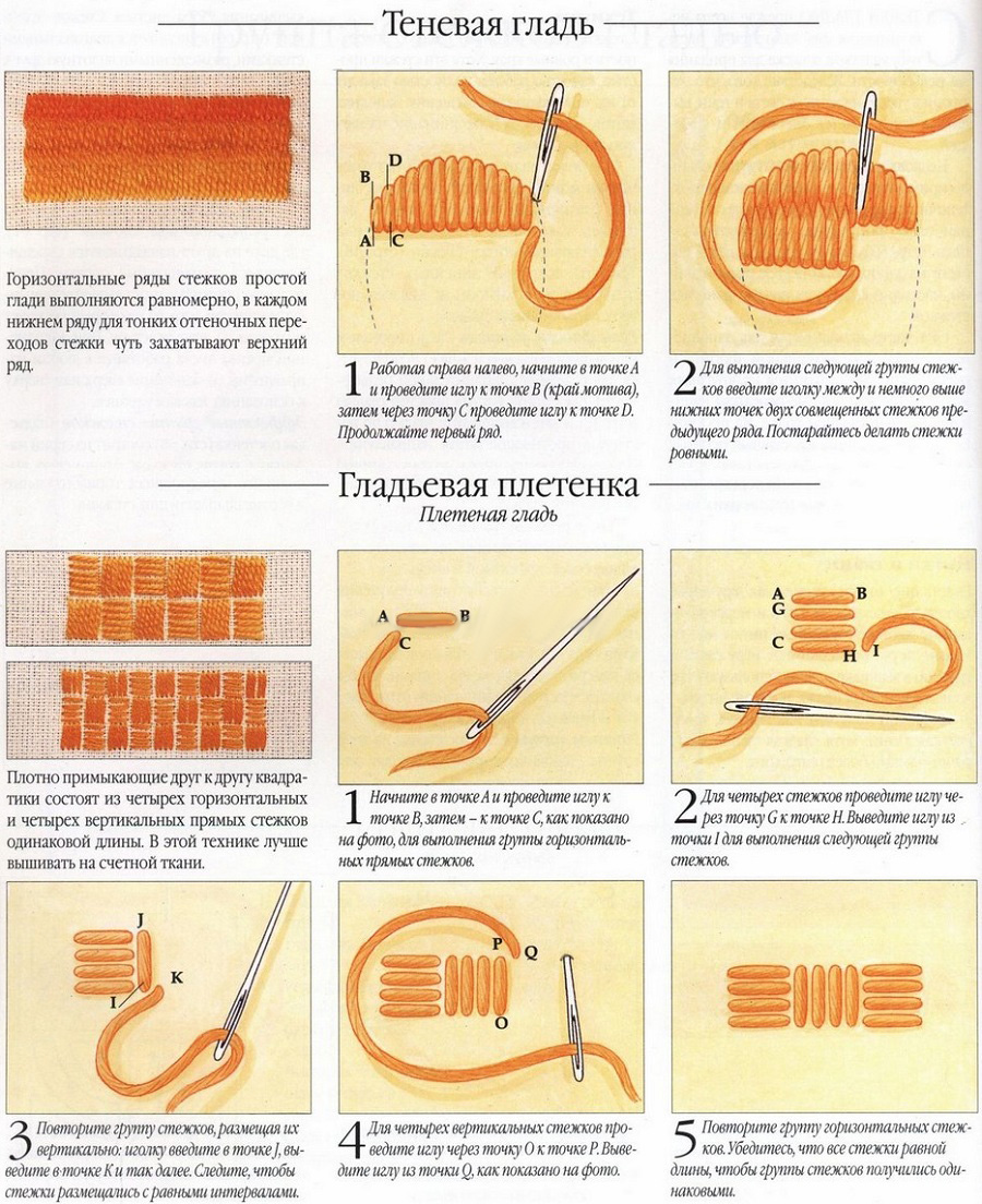 Плетёная гладь состоит из групп стежков, вышитых чёткими рядами. Акцент делается на светотени. Если вы уже немного освоили предыдущие техники, можете попробовать работать теневой гладью. Она помогает создать на изделии интересный и красивый переход цвета из одного в другой. Такой переход называется градиентом.