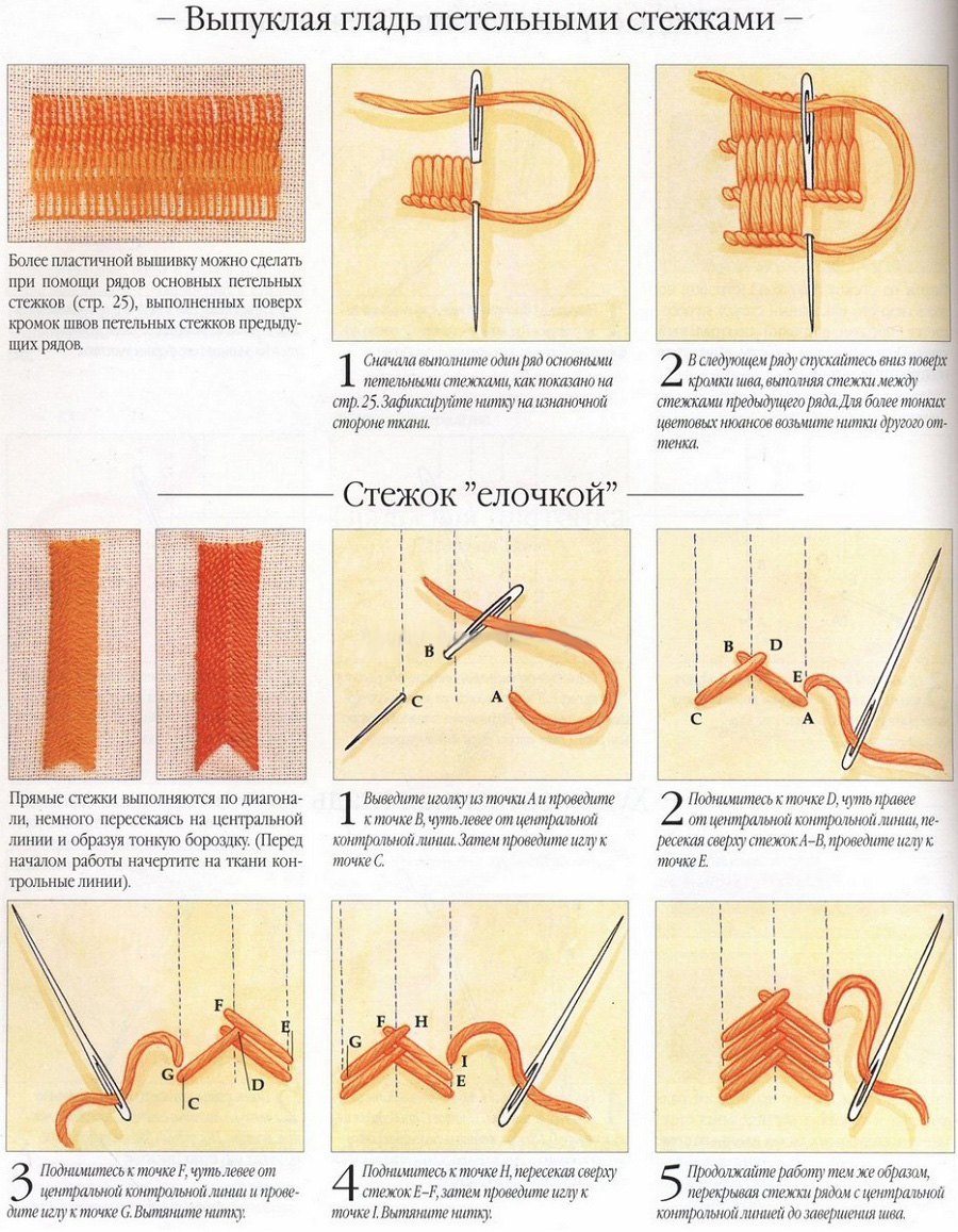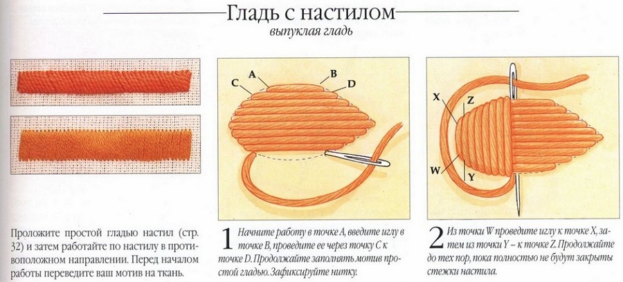Выпуклая гладь нужна для придания рисунку дополнительной рельефности. Настил вышивают простой гладью, а затем действуют в обратном направлении. Увеличиваем высоту детали и делаем её выпуклой и рельефной.