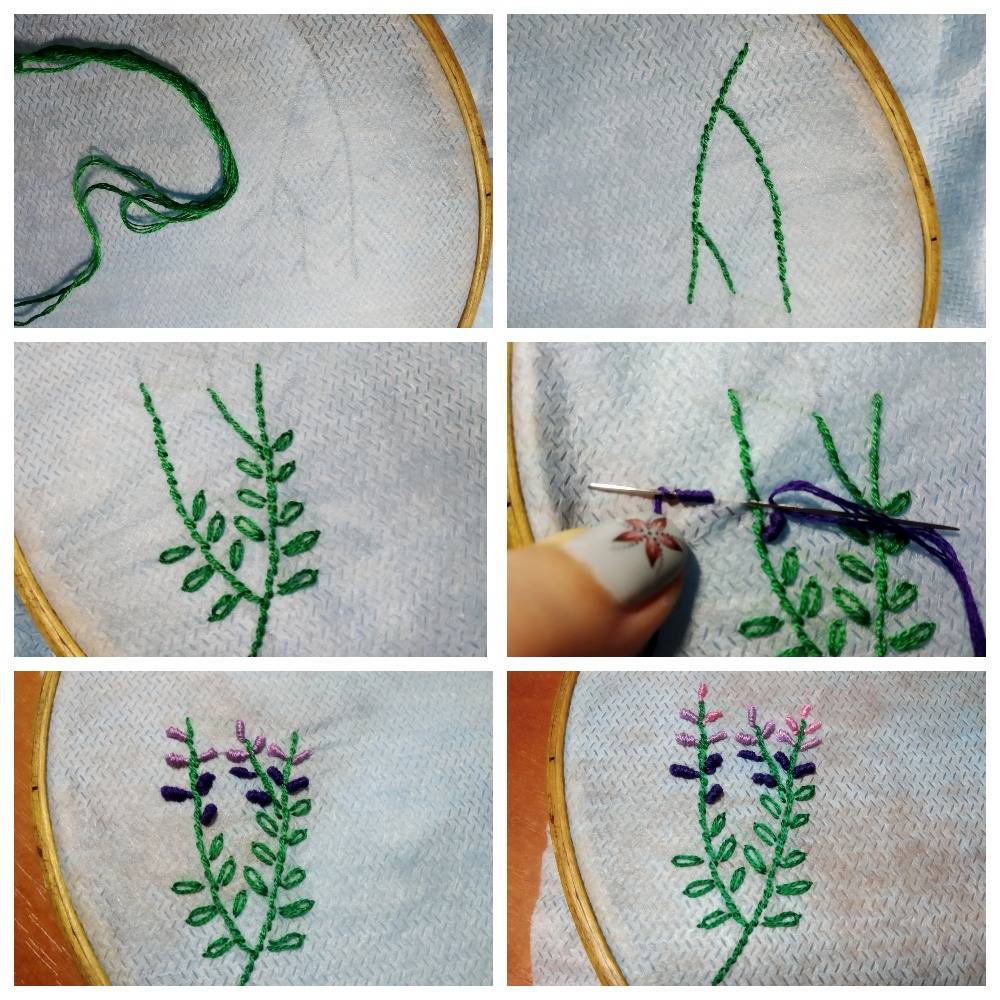 Для того, чтобы веточки и листья были «живыми» выбирай несколько оттенков зеленого, комбинируй цвета и переходы. Стебельки выполняй стебельчатым швом, мелкие узкие листики лаванды — двусторонней гладью. Для них лучше взять нить в 2 сложения.