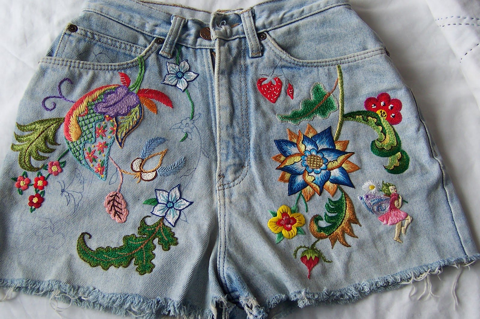 На шортах хорошо сморится машинная вышивка. Ею украшают низ изделия, пояс, карманы. Выполняется она на бытовой швейной машине любым отделочным стежком. Её можно дополнить жемчугом и бусинами. Низ на джинсовых шортах часто оставляют «лохматым». Вышивка крестиком не только украсит, но и укрепит бахрому.