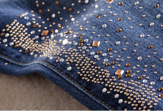 Не меньше востребованное украшение среди модниц – заклепки. Выбирать нужно материал, который хорошо будет входить в плотную ткань.