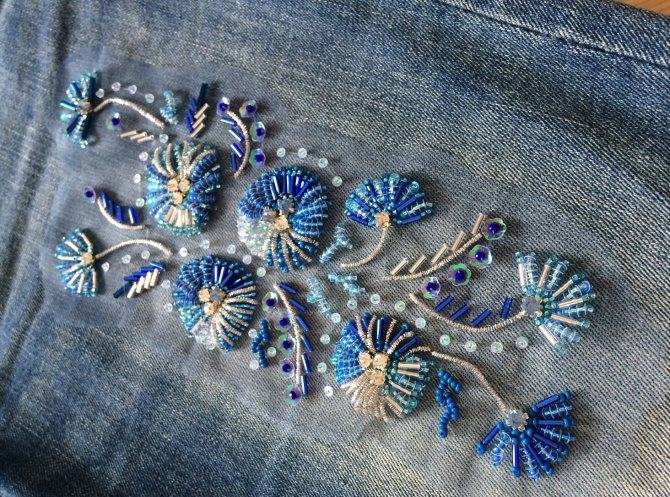 Достаточно просто собственноручно вышить бисером джинсовые брюки. Такая одежда будет выглядеть оригинально и стильно, и смотрится она как уникальная дизайнерская одежда. С учетом грубой плотности джинсового полотна применяются толстые иголки и крупные бусинки. Работа начинается с рисования необходимого орнамента на отмеченном месте аппликации. Дальше иголкой и бусинами вышивается нарисованное изображение.
