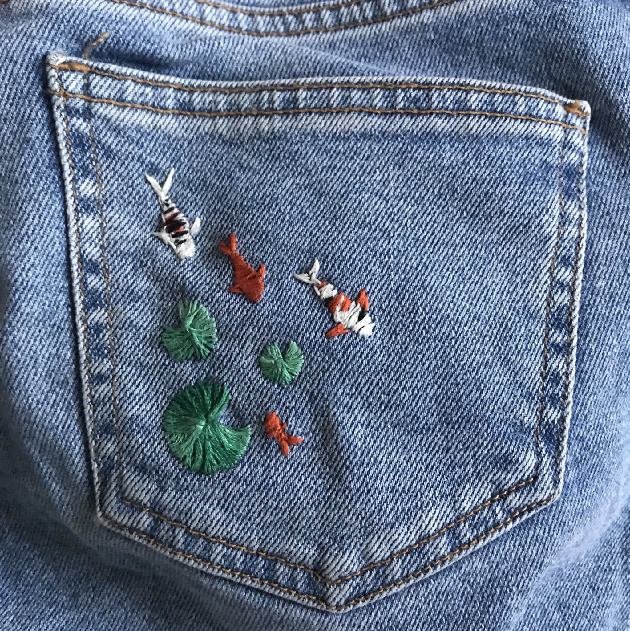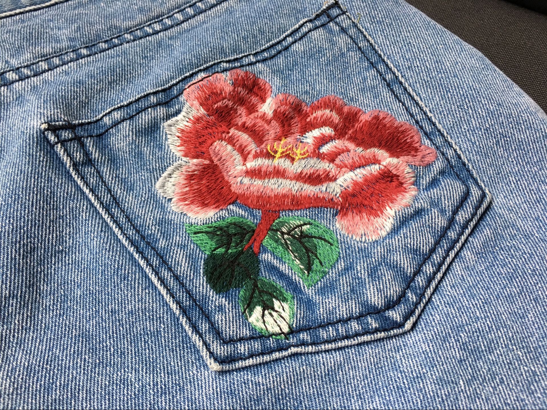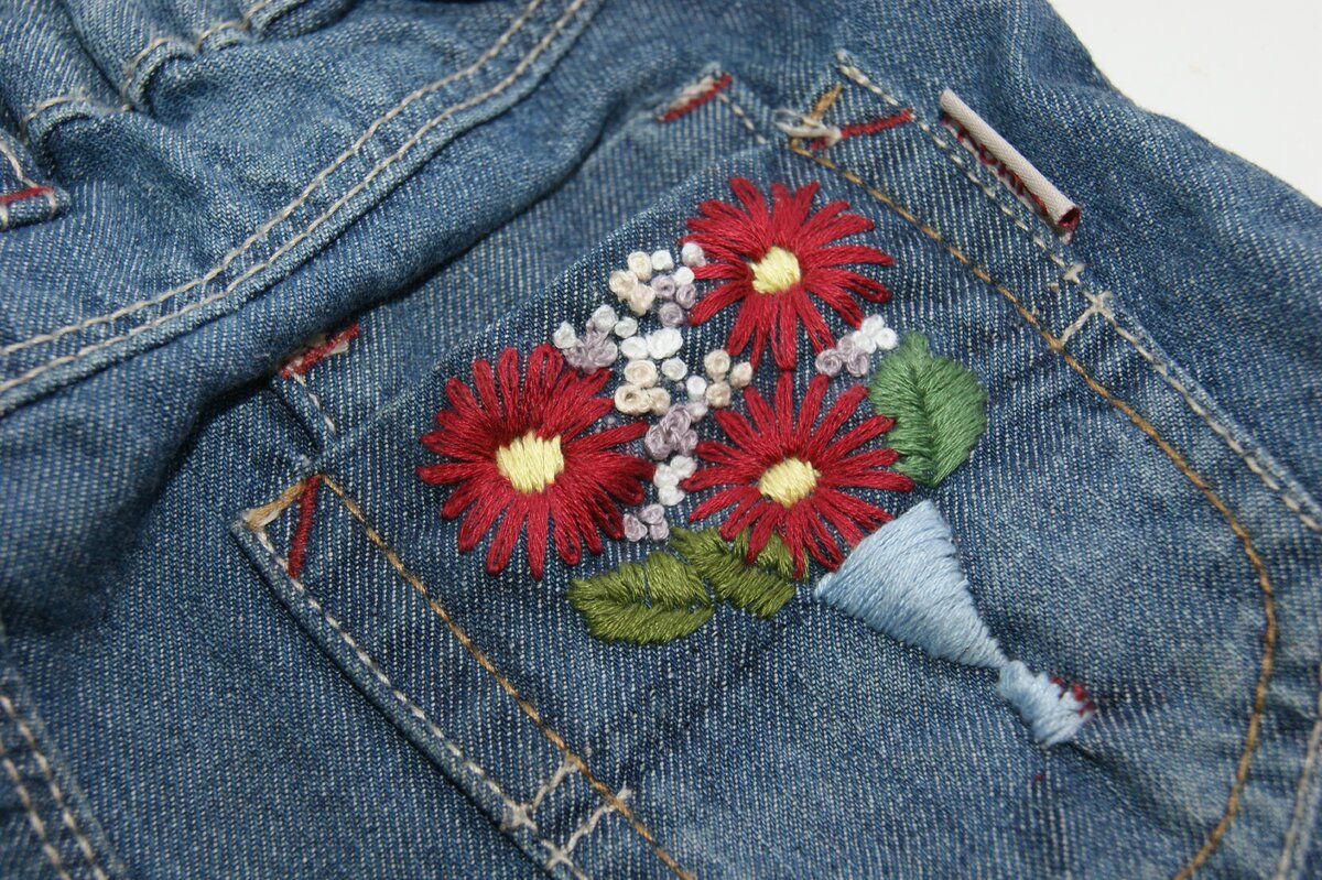 Примеры как вышивать на карманах брюк и шорт, вариант красивого декора.