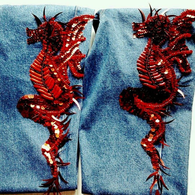 Утонченная и оригинальная японская вышивка превосходно украшает всевозможную одежду. Неординарно выглядит этот вариант на женских брюках. Такая декорация джинсов популярна среди молодежи.