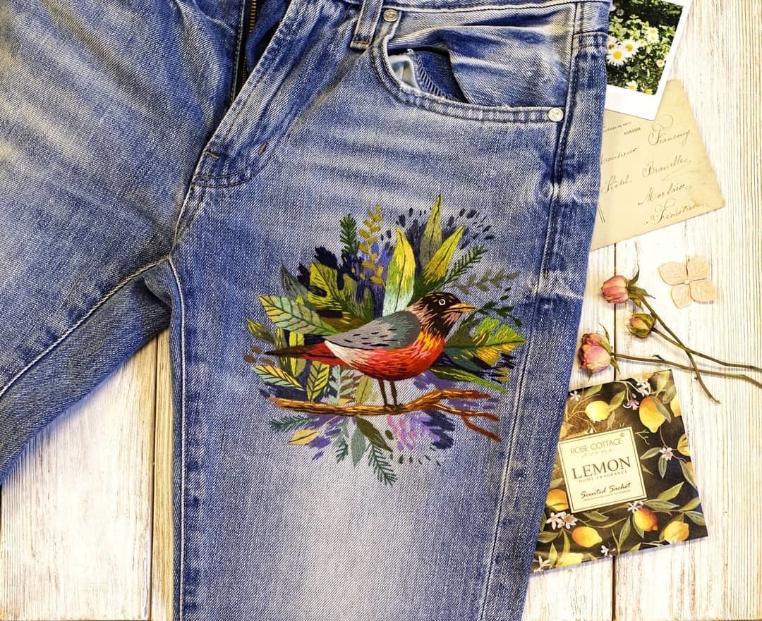 Необычные, красочные рисунки придают однотонной джинсе некий притягательный, очаровывающий шарм.