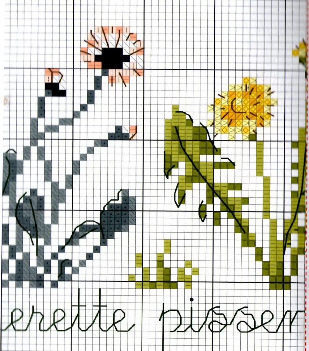 Вышивают нитью в четыре сложения. При этом один крестик вышивается на двух клетках ткани. На схеме имеются пунктирные линии, это контур, его нужно вышить светло-коричневой ниткой в два сложения строчным швом.