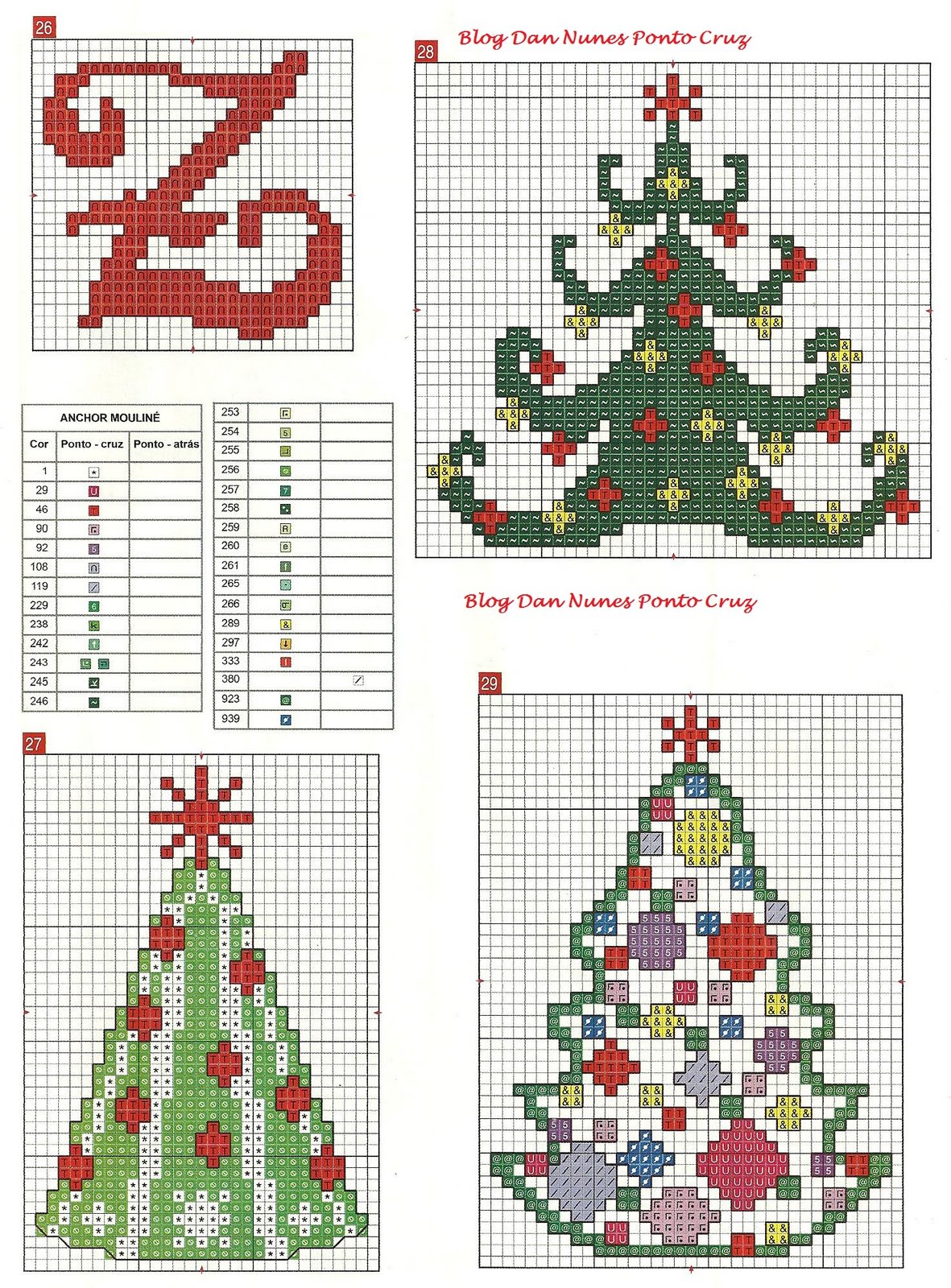 Такие маленькие елочки развеселят даже самые «скучные» рукавички. Вы можете вышить их одинаковые на двух варежках или даже разные, так будет веселее. Кроме того, это неплохая возможность утилизировать остатки разноцветных нитей, а также металлизированных остатков, которые и выбросить жаль и для больших работ они уже не пригодятся. Также к таким сюжетам отлично подойдет бисер или мелкие яркие бусинки для украшения. Для вышивки левой верхней и левой нижней елочки нужно использовать три оттенка зеленого цвета, желтый, красный, оранжевый, голубой и фиолетовый. Выполняется работа крестиком. Для верхней правой елочки количество зеленых цветов уменьшено до двух, а в правой нижней — и вовсе использован для вышивки только один зеленый оттенок.