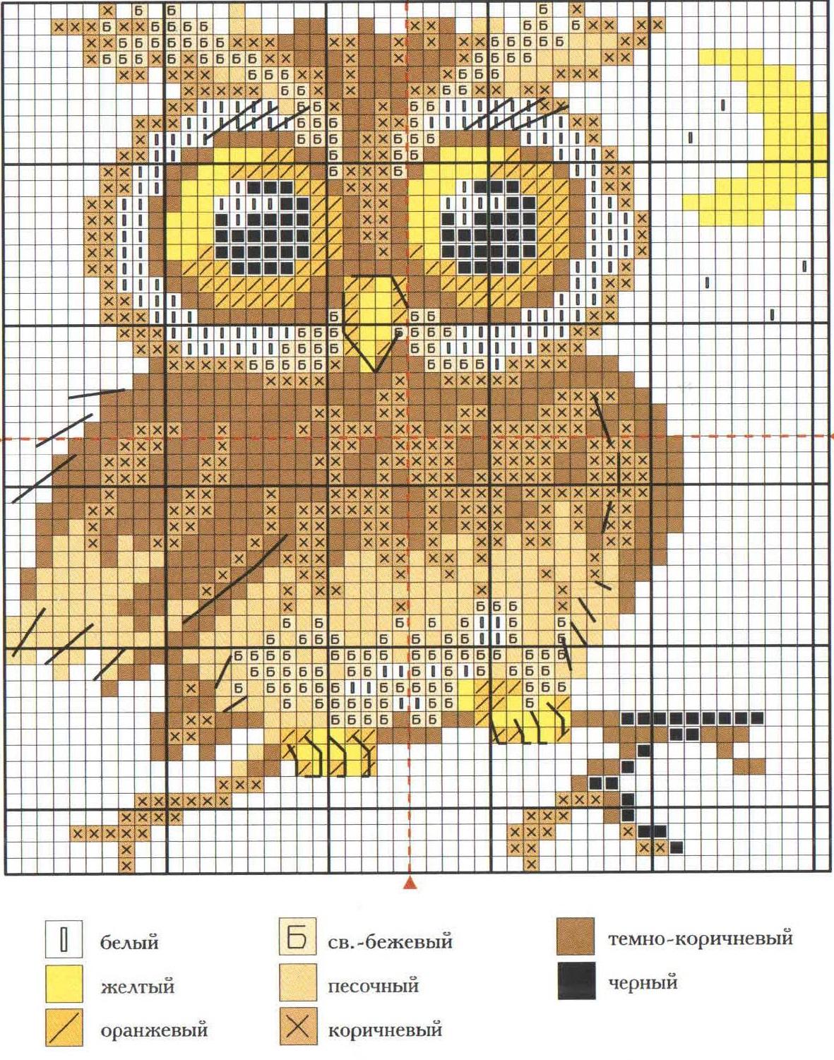Например, вышить милую совушку с ключиком мудрости. Или вышить двух сов в ночных колпачках на пижаме малыша – чем не вариант. Обязательно следуйте схеме очень строго, не ленитесь почаще себя проверять – тогда получите изображение с правильным переходом цветов. Чтобы не сбиться с переходов на фрагменты, прямо на схеме можно отмечать участки перехода.