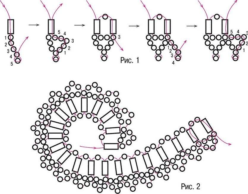 Работа продолжается с пропуском такого количества бисера в первом ряду, которое находится нанизанным в работе. В рассмотренном случае пропускается 2-4 бусинки, леска вводится в пятую бусинку. Начиная с третьего ряда, работа движется по спирали через центральные (в рассмотренном варианте через вторые) бисеринки полученных дужек. Когда достигнута желаемая длина, жгут закрепляется в кольцо, или к нему крепится специальная фурнитура.