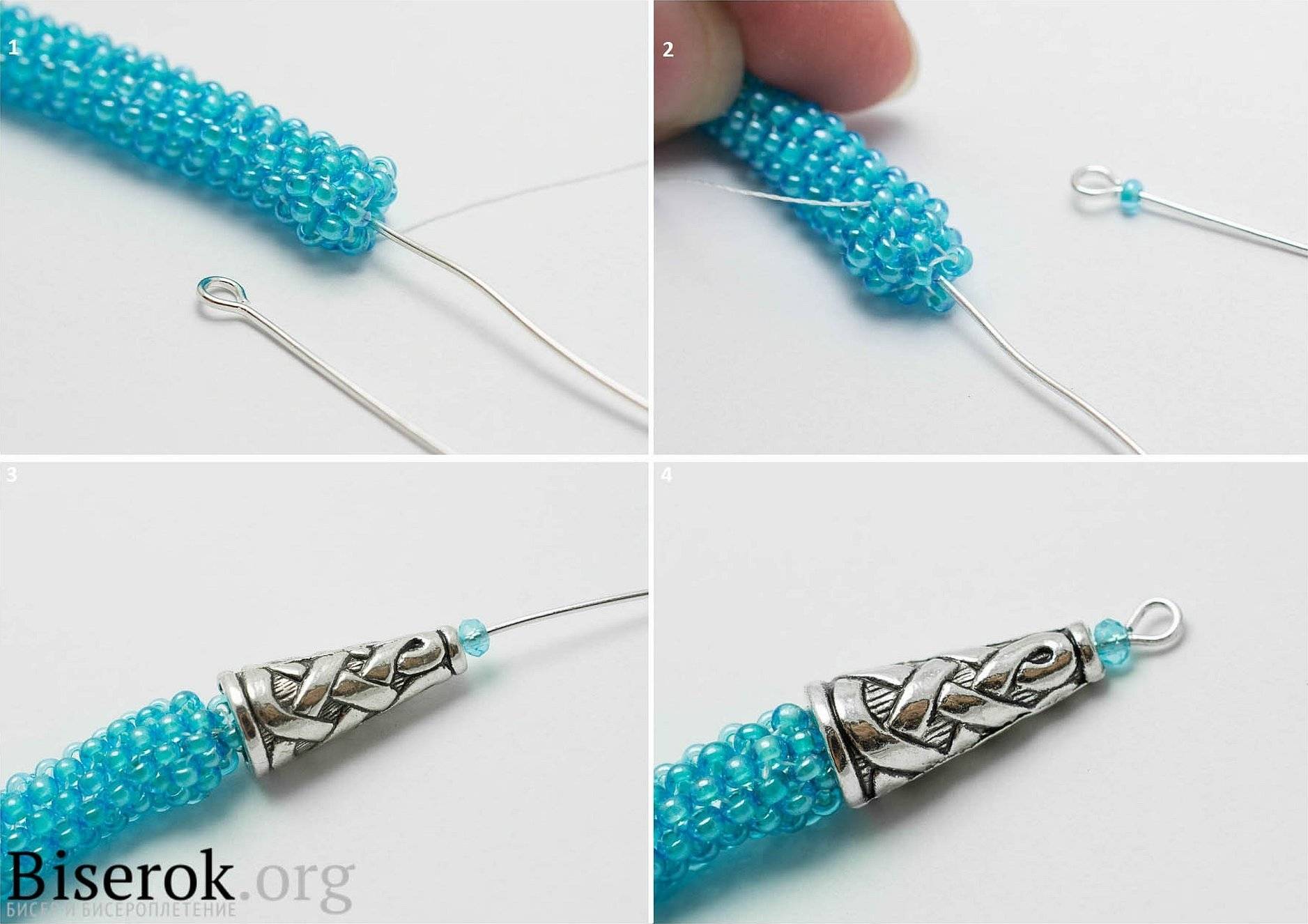 - Когда вы достигнете желаемой длины жгута, оставьте небольшой хвост нити. Опустите иглу через последний бисер, чтобы создать петлю, и протяните через нее конец нити.