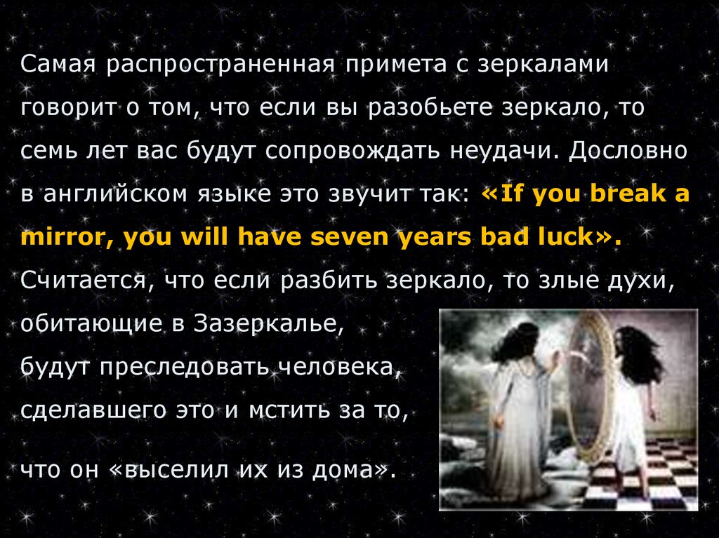 В народе зеркальная поверхность ассоциируется с входом в потусторонние миры и накопителем человеческих эмоций. Разбитое на кусочки зеркало высвобождает духов и накопленные переживания. Чтобы справиться с этим негативом, нужно избавиться от осколков, убрать помещение и оставаться спокойным.