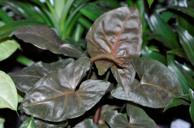 Листовые пластины Сингониума сорта Брокант имеют зеленовато-коричневый окрас с выраженным глянцевым блеском. Прожилки на листьях красные или розовые.